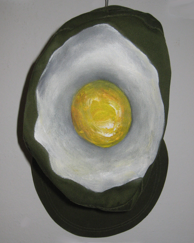 Revolution over easy, or sunny side up? This tromp l’oeil was painted on a Cuban forage cap by Yaima Comas of Ciudad Habana, Cuba. Photo taken by Bronwyn Mills while attending an artists and writers conference in La perla, January 2010. Along with numerous other images using caps as canvas, this huevo was created for an exhibit at the Artisans and Artists’ Cooperative, Matanzas. The caps, a potent symbol of the guerilla struggle against Battista’s regime, were thereafter worn by participants in a celebration commemorating the 52nd anniversary of his overthrow.