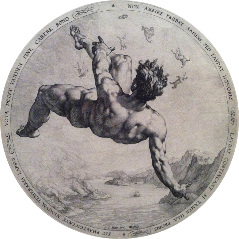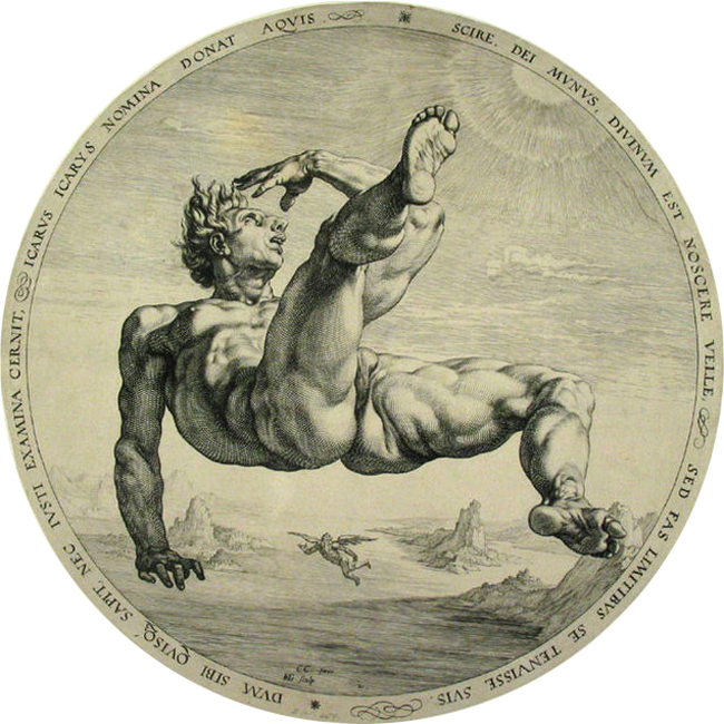 Hendrick Goltzius, “Icarus,” 1588, one of the “four disgracers” along with Phaeton, Tantalus and Ixion. Engraving after Cornelis Corneliszoon van Haarlem.