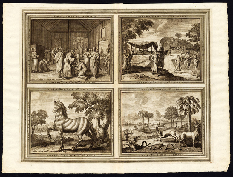 Plate with 4 engravings : “Eglise Chretienne en Congo et les ceremonies de Bateme.” (A Christian Church in Kongo and the baptism ceremonies.) “Comme les Habitans de Congo voiagent par Terre.” (How the inhabitants of Kongo travel by land.) “La Bete Zebra dans la Province Bamba en Congo.” (The Zebra beast in the province of Bamba in Kongo.) “Elephans et autres Animaux dans Congo.” (Elephants and other animals in Kongo.)
