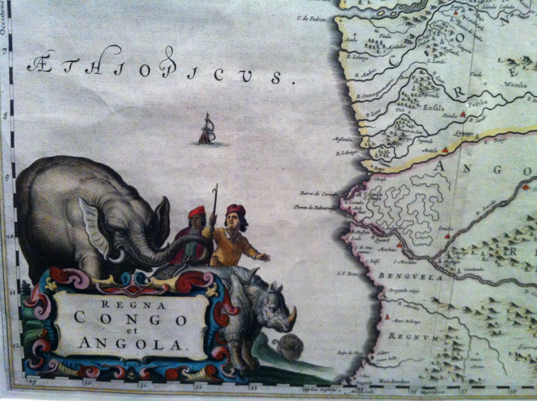 Joan Blaeu. Map of Kongo and Angola. Ink on paper. Dutch, 1662. The red shapes are toll houses where passing caravans paid tribute.
