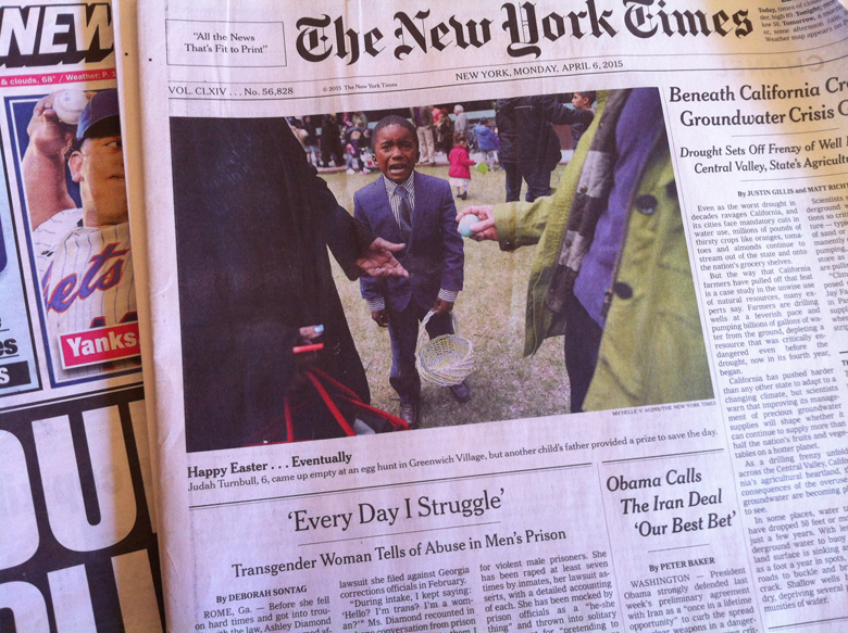 The caption reads: Happy Easter…Eventually. Judah Turnbull, 6, came up empty at an [Easter] egg hunt in Greenwich Village, but another child’s father provided a prize to save the day.